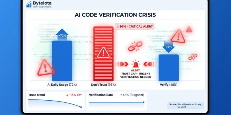 The numbers tell a stark story: AI code share has exploded from 6% in 2023 to 42% in 2026, and developers expect it to hit 65% by 2027. However, the trust-to-verification gap is widening, not closing. As AI share grows, teams that haven’t addressed verification will drown in technical debt and security vulnerabilities. Consequently, the bottleneck has shifted downstream from creation to review, and most organizations aren’t ready for it.