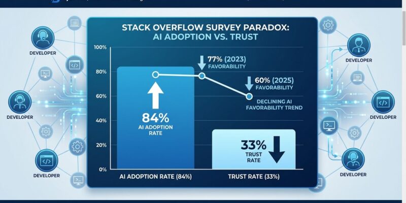 The sentiment decline is accelerating. AI favorability dropped from 77% in 2023 to 72% in 2024 (a 5-point decline), then plummeted to 60% in 2025 (a 12-point drop). The erosion rate doubled in one year. Stack Overflow CEO Prashanth Chandrasekar called out “the growing lack of trust in AI tools” as the survey’s key finding, noting that “AI is a powerful tool, but it has significant risks of misinformation or can lack complexity or relevance.”